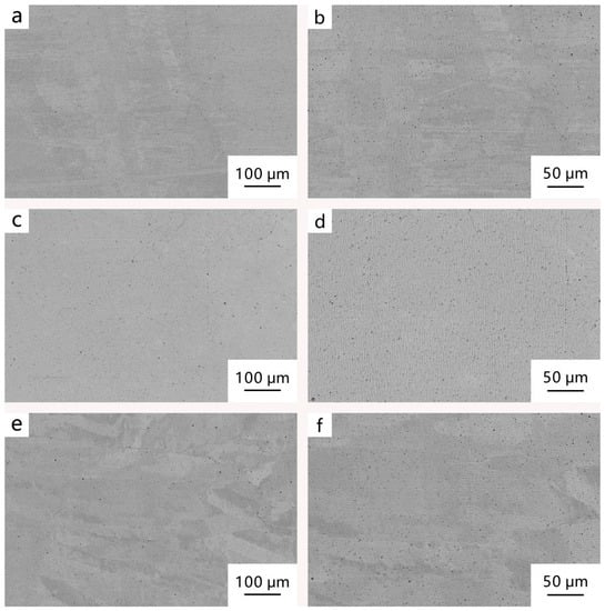SEM images of AMed CoCrFeNi HEAs at different laser powers: (a,b) 1000 W; (c,d) 1300 W; and (e,f) 1600 W.