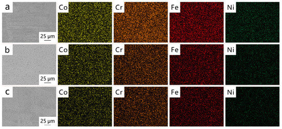 Figure 7 shows the electron dispersive spectroscopy (EDS) elemental maps of the AMed HEAs at different laser powers and Table 3 shows the corresponding component content. It can be observed that the amount of each component element is uniform in the HEAs, and the amount of each element in Table 3 further proves that the composition of HEA is uniformly distributed, as shown in Figure 7. The results indicate that all the elements are close to the nominal composition and distributed uniformly without obvious elemental segregation. This is due to the high energy density of the laser leading to the rapid melting of the metal powder, resulting in the rapid cooling and solidification of the melted metal powder. This process ensured that the elements did not have sufficient time for long-distance diffusion.