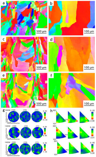 EBSD images of AMed CoCrFeNi HEAs at varying laser powers: (a,b) 1000 W; (c,d) 1300 W; and (e,f) 1600 W. PF and IPF diagrams of AMed CoCrFeNi HEAs at varying laser powers (g,h).