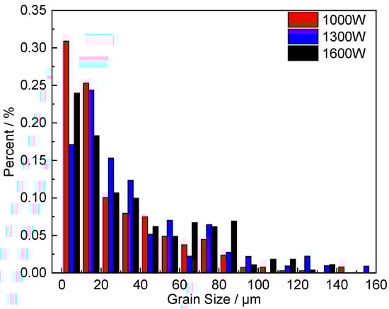 Figure 9 shows the distribution diagram of grain sizes of AMed CoCrFeNi HEAs at different laser powers, and the average grain sizes obtained from the EBSD of the specimens are given in Table 4. The grain sizes of the AMed specimens were relatively small compared to those of the cast specimens []. They increased from 91.14 μm to 112.44 μm with an increase in laser power.