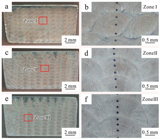 Cross-section images and microhardness traces of AMed CoCrFeNi HEAs at varying laser powers: (a,b) 1000 W; (c,d) 1300 W; and (e,f) 1600.
