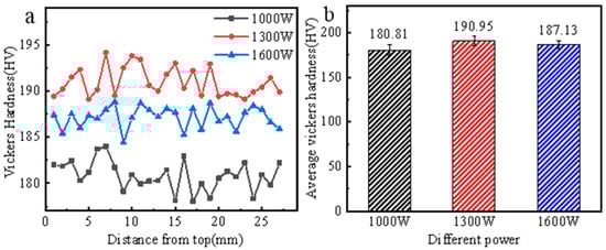 Figure 10 shows the cross-sections of the specimens and the microhardness trace tests run along the printing direction of the AMed CoCrFeNi HEAs at different laser powers. Three points were selected for each deposited layer. The results of the microhardness tests are presented in Figure 11. The overall hardness trend is relatively stable, as seen in Figure 11a, indicating that the AMed CoCrFeNi HEAs have stable performance. Figure 11b shows the average value of the microhardness values. The microhardness of all specimens was over 180 HV, higher than the reported values for a CoCrFeNi HEA manufactured using casting [] and other AM methods []. The superiority of the LMD method over those of other processes for the in situ formation of HEA due its rapid melting and solidification process was successfully demonstrated. Moreover, the maximum microhardness value of 190.95 HV was observed in the specimen produced at 1300 W, while the corresponding grain size was an intermediate value of 109.52 μm, between those of the HEAs produced using the other two laser powers.