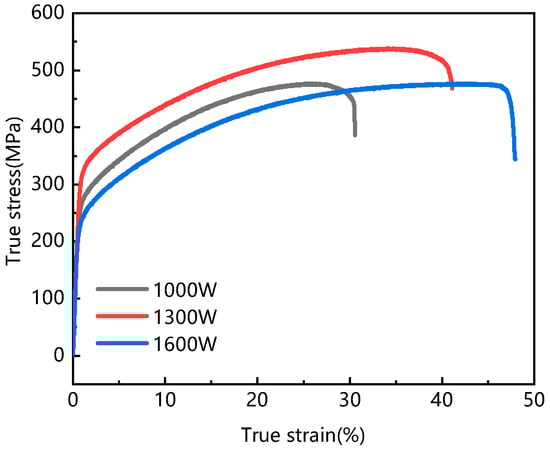 Figure 12 shows the true stress–true strain curves of the AMed CoCrFeNi HEAs at different powers of 1000 W, 1300 W, and 1600 W, with the corresponding ultimate tensile strengths being 476.4 MPa, 537.8 MPa, and 476.3 MPa. The details are given in Table 5. No yield behavior was observed due to the unique property of pure FCC HEA. Therefore, the plastic extension strength was used to characterize the yield strength, which was 248.9 MPa, 305.3 MPa, and 219.2 MPa for the laser powers of 1000 W, 1300 W, and 1600 W, respectively. The elongation increased markedly from 32.0% to 48.5%, with an increase in the laser power and grain size. When the laser power increased from 1000 W to 1300 W, the yield strength, tensile strength, and elongation of the AMed HEAs increased by 23%, 13%, and 30%, respectively. With the increase in laser power to 1600 W, the yield strength and tensile strength of the high entropy alloy significantly reduced, while the elongation increased slightly. The highest value of yield strength appeared at the laser power of 1300 W with a grain size of 109.52 μm.