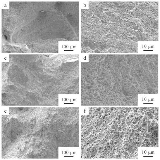 SEM morphology of tensile fracture of AMed CoCrFeNi HEAs at different laser powers: (a,b) 1000 W; (c,d) 1300 W; and (e,f) 1600 W.