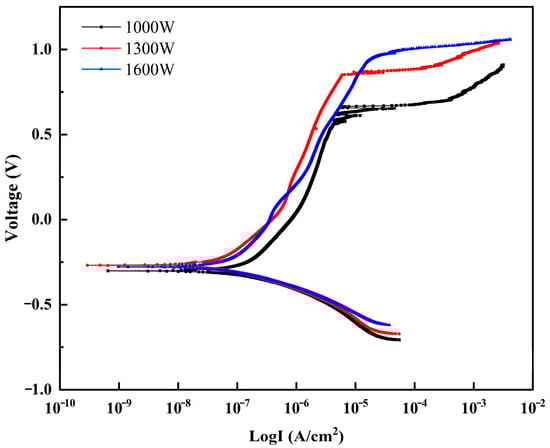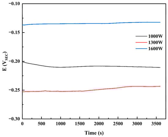 Figure 14 shows the variation in the OCP of AMed CoCrFeNi HEAs at different laser powers in 3.5 wt.% NaCl. The OCP became stable over 3000 s, indicating the formation of passive films, with that of the 1600 W specimen being the highest among all three cases. The OCP was relatively stable, indicating that the corrosion process and the corrosion products on the surface had reached a stable state.