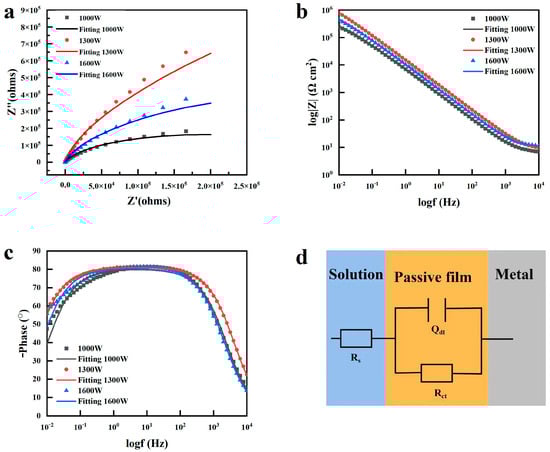 where Y is the proportionality factor, ω is the angular frequency, and n is the surface inhomogeneity exponent. The larger the value of n, the denser the passivation film []. Once a dense passive film forms and grows in a stable state, it prevents the charge transfer process between the alloy and the solution, reflecting a larger Rct value and implying a better corrosion resistance. The EIS fitting data in Table 7 show that the Rct and n of the 1300 W specimen were highest, with values of 1.7687 × 106 Ω·cm2 and 0.90129, indicating that its corrosion resistance was the best and the passive film was the most dense among all the specimens, which is consistent with the results of the potentiodynamic polarization.