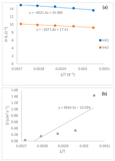 Plotting ln k vs. 1/T (a) and D versus 1/T (b) HTPB-TDI system.