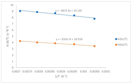 The activation enthalpy and entropy of curing were obtained from plotting ln(k/T) versus (1/T) following Equation (8) (Eyring equation), as shown in Figure 6. The value of (-ΔH) is the slope and (ΔS/R + ln(R/Nh) is the intercept. The values of ΔS and ΔH are also summarized in Table 2. It was observed that the activation entropy of k1 was negatively larger than k2, indicating that the catalytic part exhibited easier formation of the transition state.