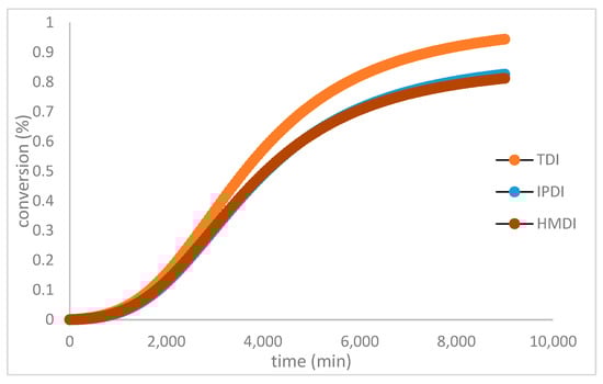 The curing conversion profile of polyurethane-based HTPB with various diisocyanates.