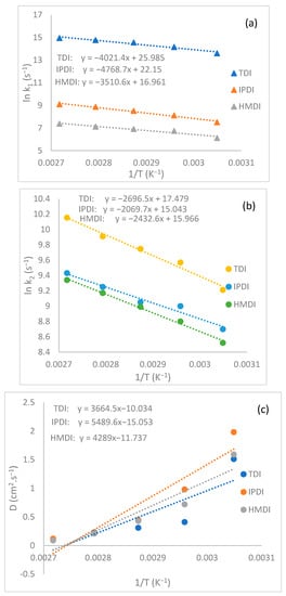 Plotting ln(k1) vs. 1/T (a), ln (k2) vs. 1/T (b), and D vs. (1/T) (c) with various isocyanates.