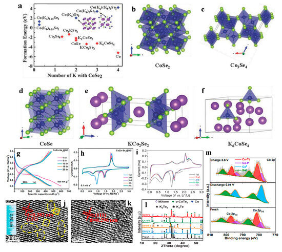 - Yang, S.H.; Park, S.K.; Park, G.D.; Lee, J.H.; Kang, Y.C. Conversion Reaction Mechanism of Ultrafine Bimetallic Co–Fe Selenides Embedded in Hollow Mesoporous Carbon Nanospheres and Their Excellent K-Ion Storage Performance. Small 2020, 16, e2002345. [Google Scholar] [CrossRef]