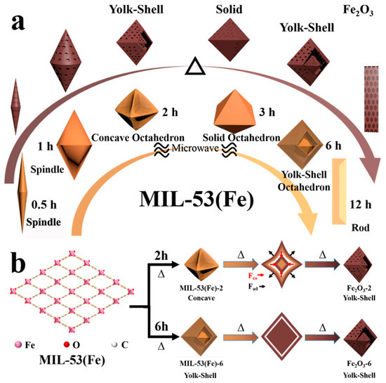 - Guo, W.; Sun, W.; Lv, L.P.; Kong, S.; Wang, Y. Microwave-Assisted Morphology Evolution of Fe-Based Metal-Organic Frameworks and Their Derived Fe2O3 Nanostructures for Li-Ion Storage. ACS Nano 2017, 11, 4198–4205. [Google Scholar] [CrossRef] [PubMed]