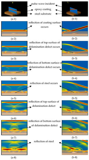 In addition, simulated results obtained by the preset point sensors ((−1, 0, 1.2) and (−1, 0, 1.0), respectively, with the vertical incidence mode were shown in Figure 4, where (a) was the recorded reflection of the coating with no defect and (b) was that of the coating with a delamination defect. Due to the energy loss of the wave propagation, the collected time domain data were different for various locations of the point sensors. When the point sensor was set far away from the coating surface (here the point sensor (−1, 0, 1.2) was farther than the point sensor (−1, 0, 1.0)), the sidelobe effect of the reflected pulse was more evident. This performance was not beneficial for the defective structural analysis because the sidelobe effect would overlap with the defect information.