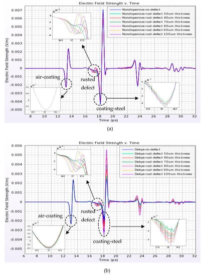 Anyway, for the coated steel plate, the epoxy protective layer may degrade with long-term service. The gradually aged process would cause the medium’s characteristics to change. It has been verified that the dielectric constant of the coating would decrease due to aging, which is the main reason for the weakened inhibition of the coating on particles []. Therefore, the coating layer degradation monitoring during its service process can provide an important reference for the engineers to prevent the premature appearance of corrosion degradation. Herein, the situation of coating deterioration was simulated: One was adopting the Nondispersive model, where the conductivity change with the service time was taken into account but the static permittivity was not; the other established the epoxy coating as the Debye model, where both the dielectric parameters and conductivity change with the service time according to the values provided by the reference []. Figure 7 shows the simulation results of the aging coating using various medium models, where the epoxy coating layer was set at 380 μm thickness (a) in Nondispersive mode and (b) in Debye model. With the Nondispersive model, if only considering the conductivity change of paint, there was hardly any change as the service time increased; therefore, it was impossible to provide more information about the aging of the coating. While using the Debye model, it can be seen that the change in the electromagnetic properties of the coating caused by the aging could be manifested significantly with terahertz wave propagation. The electrical conductivity of the coating increases with aging and deterioration, and as the dielectric constant becomes smaller, the dielectric loss decreases. Therefore, the results obtained with Debye model simulation could better reflect the pulsed terahertz wave propagation in organic coatings.