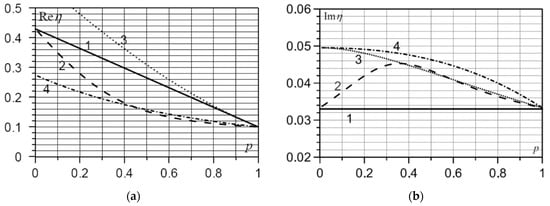 The calculated real (a) and imaginary (b) parts of the inverse susceptibility, η, plotted against the volume concentration of the inclusions in the composite. The numbers indicate the dependencies for the various mixing rules: 1—the MG model, 2—the EMT, 3—the asymmetric Bruggeman theory, 4—the LLL formula.