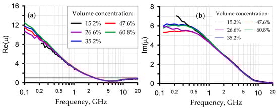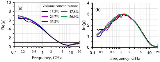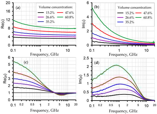 The measured frequency dependencies of permittivity and permeability of the composite materials filled with stone-like ferrite particles are shown in Figure 4. The color indicates the volume fraction of the ferrite powder in the sample. The frequency dependence of the imaginary permittivity is smoother than that characteristic of a conductive material.