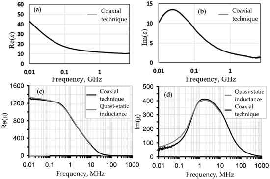 The frequency dependencies of microwave permittivity ε(f) and permeability μ(f) are measured with a vector network analyzer. The parameters of the bulk ferrites are measured by the coaxial technique [32,33] in a 16/7 mm coaxial line in the frequency range of 10 kHz to 1 GHz. The parameters of the composite materials filled with ferrite powders are measured by the transmission-reflection (Nicolson–Ross–Weir [34,35]) technique in a 7/3 mm coaxial line in the frequency range of 0.1 to 20 GHz. Additionally, the permeability of the bulk ferrite is determined from the quasi-static measurements of the inductance [32] of the coil with a ferrite ring in the frequency range of 1 kHz to 10 MHz.