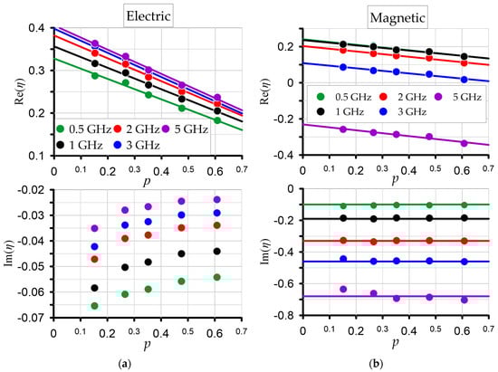 The inverse susceptibility η approach mentioned above is used to analyze the measured frequency dependencies of permittivity and permeability. The real and imaginary parts of inverse normalized susceptibility are derived from the measured data. The dependencies of inverse electric susceptibility on the volume fraction are shown in Figure 6a, and the data for the magnetic susceptibility are shown in Figure 6b. The dependencies are shown at frequencies of 0.5 to 5 GHz. The dependence of the real inverse magnetic susceptibility at a frequency of 0.5 GHz is close to that at a frequency of 1 GHz.