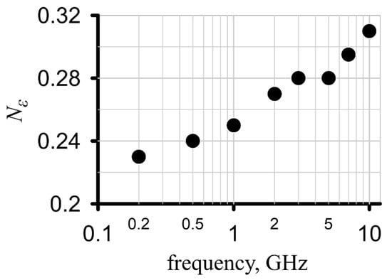 The electric susceptibility dependence behaves differently from the magnetic one. The real part of the inverse dielectric susceptibility has a linear dependence on concentration, which is typical for the Maxwell–Garnett mixing rule, see Figure 1. However, the imaginary part is not constant and has a systematic concentration dependence that is the same for all observed frequencies. Therefore, the MG mixing rule is not applicable to the permittivity. Moreover, the form factor found from the electric inverse susceptibility changes with the frequency, see Figure 7, and is different from the form factor obtained from the permeability data. Thus, it is experimentally shown that the permittivity and permeability obey different mixing rules.