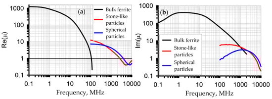 The composites filled with the spherical ferrite inclusions are additionally investigated. The SEM image of the particles is shown in Figure 3a. They are studied in the same way as the composites with stone-like particles. The frequency dependencies of the material parameters are measured, the inverse susceptibilities are calculated, and the intrinsic permeability of the inclusions is found. Its frequency dependence is shown in Figure 9. The intrinsic permeability is also retrieved by the MG model (1) with high accuracy but also does not coincide with that of the bulk ferrite, see Figure 10. Moreover, it does not match the permeability of the stone-like inclusions.