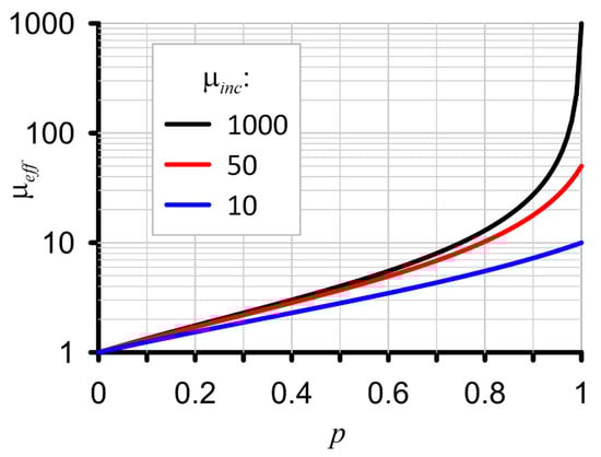 The theoretical dependencies of the static permeability of a composite on the volume fraction of inclusions calculated using the MG model.