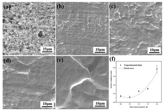 where R is surface roughness, and t is the time value in hours. The fitting relationship reveals that the variation in roughness remains relatively small within a treatment time of 1 h, but it exhibits a rapid increase after 1.5 h of treatment. In summary, when the pretreatment time is less than 1.5 h, although the surface roughness tends to increase with longer pretreatment durations, there is a slight improvement in flatness.