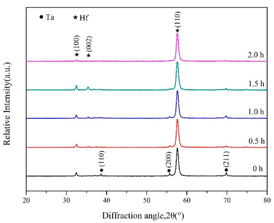 Figure 4 shows the cross-sectional morphology and EDS results of Hf coatings on pretreated Ta substrates for various durations. The coatings present a uniform and compact structure, devoid of any micro holes or cracks either within the coatings or at the substrate–coating interfaces. The EDS results reveal that the coatings, comprising deposition and interdiffusion layers, exhibit a greater thickness on pretreated substrates. Specifically, the coating obtained on the substrate pretreated for 1 h manifests the utmost thickness of approximately 14 μm, whereby the deposition layer and interdiffusion layer increase to 10 μm and 4 μm, respectively. These outcomes signify that plasma surface pretreatment significantly enhances coating thickness due to the heightened efficiency of atom diffusion, primarily attributed to increased surface defects and elevated surface energy [25].