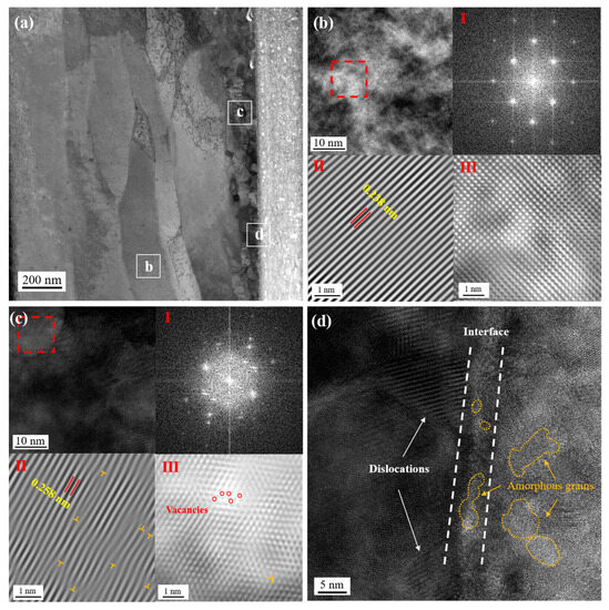 To obtain atomic-scale details of the interface between the coating and the substrate, High-Resolution Transmission Electron Microscopy (HR-TEM) images were captured and are presented in Figure 8. Figure 8b shows a high-magnification image of the internal substrate within the region denoted as box b in Figure 8a. This image is accompanied by the corresponding Fast Fourier Transform (FFT), Inverse Fast Fourier Transform (IFFT), and atomic arrangement images within the same region. An analysis reveals that the single-layer crystal face spacing in the Ta substrate measures 0.238 nm with a well-organized atomic arrangement and no noticeable lattice defects. Figure 8c provides analogous information to Figure 8b but specifically focuses on the sputtering-affected layer of the substrate. It becomes apparent that the sputtering-affected layer exhibits a larger single-layer crystal face spacing of 0.258 nm compared to the internal Ta substrate. Moreover, a significant number of dislocations and vacancies are observed in this region. These high-energy defects are highly conducive to the diffusion of coating atoms into the substrate and their subsequent binding with the substrate atoms [8]. This not only enhances the bonding strength of the coating but also helps to mitigate abrupt changes in the physical and chemical properties resulting from the gradient distribution of the Ta and Hf elements, so that the coating can exhibit significantly heightened dependability and enhanced performance throughout its service cycle. Figure 8d presents a high-magnification image of the coating–substrate interface region. A substantial number of dislocations are evident on the substrate side; concurrently, nanocrystalline and nano-amorphous grains exist on both the interface and coating side. In addition, the continuous gradient structure induces interface fuzziness, thereby promoting enhanced stability in stress release within the coating. Consequently, it effectively mitigates the stress gradient on both sides of the interface arising from structural mutations. These structural features play a pivotal role in enhancing the coating’s toughness, bolstering adhesion, and fortifying its resistance against external damage.