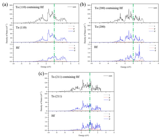Figure 10 shows that Hf in the slab of the (200) crystal face has the highest electron energy level, with 3.3 eV−1, which is more than twice that of the (110) crystal face, which has the lowest energy level at 1.3 eV−1. This indicates that Hf atoms can more easily combine with the (200) and (211) crystal faces of Ta [28]. Additionally, the (200) crystal face has the lowest energy level at the Fermi energy among the three Ta slabs, indicating that Hf in the slab of the (200) crystal face has the most stable state. Therefore, the Hf coating can easily combine with the substrate and exist more stably, thereby improving both the thickness and adhesion performance of Hf coatings.