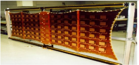 Dielectric-coated films are becoming indispensable carriers in the field of flexible electronics and are widely studied in the fields of wearable devices and aerospace antennas []. Thin-film phased-array antennas are a new generation of phased-array antennas based on flat-panel phased-array antennas, combined with thin-film composite materials as carriers []. The direct-array flexible thin-film antenna is an active antenna where the reflecting surface made of the T/R (transmitter/receiver) module is integrated on the film or on the deployable structure to perform the function of the antenna, as shown in Figure 1 [,,].
