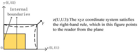 The models were built by ABAQUS as finite element models (FEMs). The boundary setting of model 1 was two inner sides setting symmetrical and two outer sides setting free with corner point setting displacement. The coordinate system in the simulation is shown in Figure 3, and the coordinate unit is unified as mm. In this paper, the out-of-plane displacement (z-direction displacements, shown as U, U3 in the simulation result plots later) is an important parameter for evaluating the wrinkling deformation.