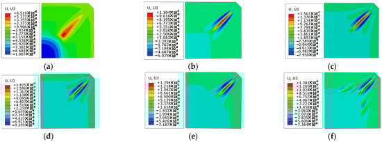 FEM wrinkling results of corner loading in different sizes of coated areas (0.025 mm thick membrane, unit of U3 is mm). (a) = 0.4; (b) = 0.45; (c) = 0.5; (d) = 0.55; (e) = 0.6; (f) = 0.65.