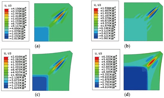 FEM wrinkling results of corner loading in different size of patch and thickness of membrane (unit of U3 is mm). (a) = 0.4 and rectangular boundary shape; (b) = 0.6 and rectangular boundary shape; (c) = 0.4 and parabolic boundary shape; (d) = 0.6 and parabolic boundary shape.