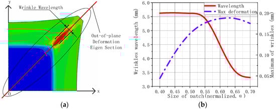 Figure 4 and Figure 5 show that neither the size of the coating area nor the boundary shape effects affect the crease deformation characteristics in the direction of the tensile load. Therefore, this section measures the wrinkling characteristics for different structural parameters, with the wrinkling deformation shown in the area of Figure 6a. For the convenience of description, the wavelength in this paper is defined as the width of the wrinkle (on the line of Figure 6), which is a main characteristic of wrinkles.