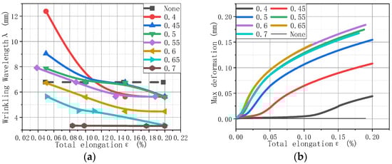 Wavelength and max deformation vary by total elongation, (a) wavelength (mm) varies by total elongation (%); (b) max deformation (mm) varies by total elongation (%).