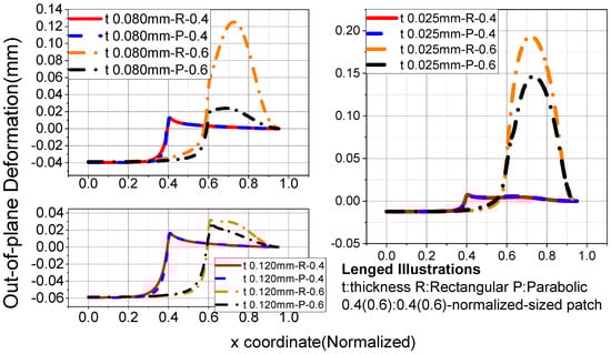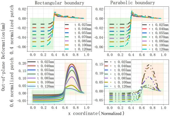Figure 8 gives a comparison of the out-of-plane fold deformation curves and magnitudes for three thicknesses, two boundaries, and two patch sizes. The thicknesses are the same in each plot, red and orange represent square boundaries while blue and black represent parabolic boundaries, and the horizontal axis can be read off for different width ratios . There are two typical deformation curves in Figure 8, the difference between them is whether the deformation in the film region has a “peak curve” or not.