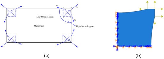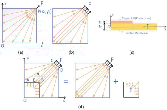 Deformation patterns can be analyzed by stress analysis and the thin plate deformation theory. Figure 10 gives an illustration of the stress distribution. Figure 10a shows the stress distribution at the corner tensioning of the concentrated load, and it is worth noting that in this case the distribution is uniform in the circumferential direction. Figure 10b shows the stress distribution for a localized uniform load, which is in the form of an axial tensile load extending to the inner section of the film due to the presence of a section of uniform load, but outside this area (near the free boundary), the stresses are still uniformly distributed in a circumferential direction. Based on this, Figure 10d shows the superposition of stress states. The squares with black borders represent coated areas, which have very little displacement at its boundary due to the much greater tensile stiffness of the coated area than the film. But, due to the asymmetrical lay-up arrangement, a bending load is generated at coated area’s boundary, which is caused by the transfer of tension F to the connection between the coated area and the film, and the force f perpendicular to the coated area represents this equivalent load; f is not on the middle surface of the coating area and is conducted by the composite interface between the film and the coated area. It is worth noting that f is not perfectly uniformly distributed over the boundary of the coating area, but is related to the distance of F.