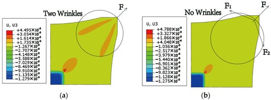 So, the wrinkling deformation region in the form of the deformation shown in Figure 4 and Figure 5 is influenced by the stretching–bending coupling effect.