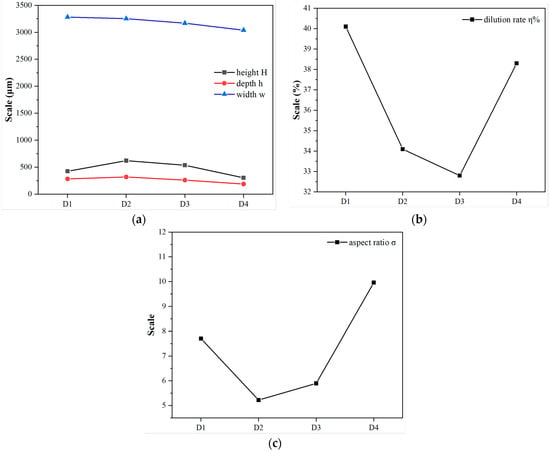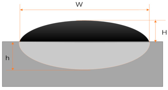 The dilution rate and aspect ratio are important parameters used to evaluate the performance indicators of laser-cladded layers. The dilution rate refers to the extent of changes in the composition of the cladding alloy caused by the mixing of the melted substrate during laser cladding, which can be expressed as the percentage of the substrate alloy in the total laser-cladded layer. In general, a high dilution rate can lead to the cracking and deformation of the laser-cladded layer, while a low dilution rate can result in poor adhesion between the laser-cladded layer and the substrate, thereby affecting the overall performance of the laser-cladded layer. Therefore, the dilution rate is an important parameter to characterize the laser-cladded layer []. The aspect ratio refers to the ratio between the width and depth of the cladding area obtained through laser cladding, which can affect the cladding quality and efficiency. If the aspect ratio is too large or too small, it may lead to uneven or incomplete melting during the cladding process, thereby affecting the processing quality and efficiency []. Figure 2 shows the geometric characteristics of the cross section of the laser-cladded layer, and the calculations of the geometric dilution rate and aspect ratio are given by Equations (1) and (2).