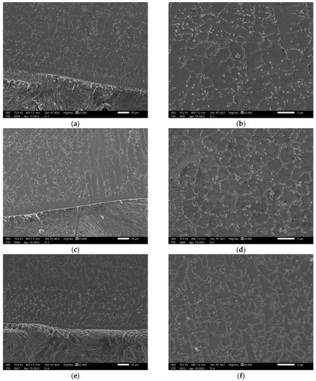 Figure 4 shows the microstructure of the laser-cladded layer at its interface with the substrate. From Figure 4, it can be observed that the microstructure of the laser-cladded layer changes from plane crystals and dendritic crystals near its interface with the substrate, gradually transforming into columnar crystals, and finally transitioning to equiaxed crystals in the upper region []. The main reason for this is the synergistic effect of the temperature gradient (G) and solidification rate (R) in determining the grain morphology []. During the initial stages of solidification at the interface between the laser-cladded layer and the substrate, the laser-cladding process involves rapid heating and rapid cooling. At this stage, the temperature gradient G is the largest, but the solidification rate R is the smallest, resulting in no undercooling []. The heat released during solidification flows entirely towards the substrate, and due to the similarity in chemical composition between the laser-cladded layer material and the substrate, there is a small surface tension at the interface, resulting in slower growth and the formation of plane crystals. As solidification progresses, the temperature gradient G at the solidification interface decreases, and the solidification rate R increases, leading to increased undercooling. At this stage, the grains have sufficient growth time, resulting in the formation of columnar crystals. The growth direction of the grains is along the heat dissipation direction, which is perpendicular to the interface between the laser-cladded layer and the substrate. As a result, columnar crystals grow in the direction perpendicular to the interface []. With a further increase in undercooling, i.e., a decrease in G and an increase in R, nucleation occurs not only at the solidification interface but also within the liquid metal. The distribution of nuclei is uniform, and the growth of these grains is restricted by the surrounding grains, leading to the formation of equiaxed crystals []. Additionally, the high thermal conductivity of WC and its dispersion within the molten pool can change the heat dissipation conditions during solidification, leading to a transformation in the overall grain morphology of the composite coating. Therefore, with an increase in WC content, the equiaxed crystals formed in the laser-cladded layer become finer and more uniform [].
