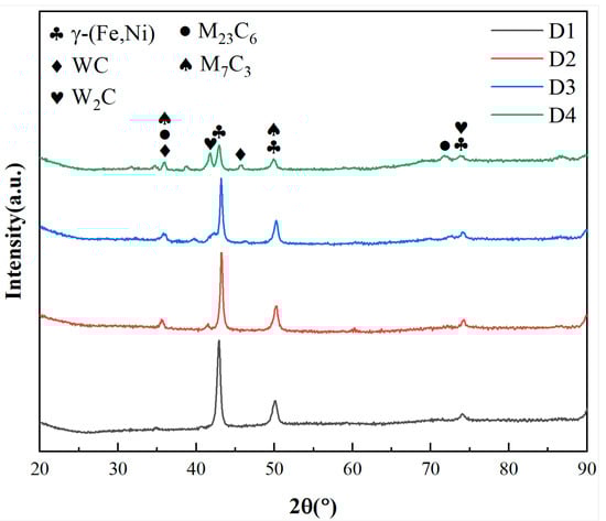 Figure 5 shows the XRD patterns of the coatings with different contents of WC added. All coatings were found to contain γ-(Fe,Ni), WC, W2C, M23C6, and M7C3 phases, indicating the successful embedding of WC particles into the WC nickel-based coating. The diffraction peaks of γ-(Fe,Ni) grains in the D1 laser-cladded layer were the highest and narrowest. On the other hand, the diffraction peaks of the γ-(Fe,Ni) grains in the D4 laser-cladded layer were weaker and broader, indicating a finer coating structure. It can also be observed that as the WC content increased, the diffraction peaks became weaker and broader, indicating the strengthening effect of the fine crystalline structure with the addition of WC. These findings are consistent with the microstructure observations.