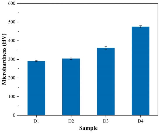 Figure 6 shows the surface hardness map of laser-cladded layers with different WC contents. From the hardness map, it can be observed that the coating with a 10% WC content had the lowest hardness, with a value of only 290.24 HV. As the WC content increased, the hardness of the coating gradually increased. When the WC content reached 40%, the average hardness could reach 474.8 HV, indicating that an increase in WC content can enhance the hardness of the laser-cladded layer. This can be attributed to the following reasons: Firstly, WC particles themselves are very hard (around 2600 HV) and do not completely dissolve in the composite coating, maintaining a better reinforcement effect. Secondly, as some WC particles dissolve in the matrix phase, they contribute to the solid solution strengthening of the matrix, thereby increasing the microhardness of the laser-cladded layer. Finally, with an increase in WC content, the grain structure of the laser-cladded layer becomes finer, resulting in increased grain-boundary strengthening and the improved microhardness of the laser-cladded layer [].