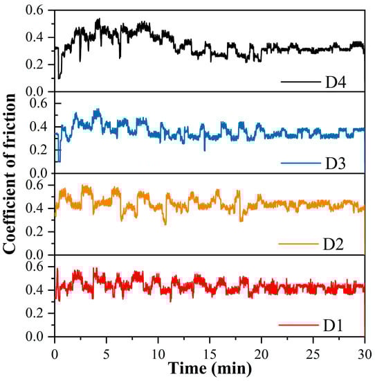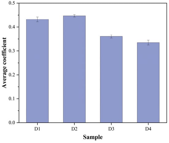 Figure 7 shows the friction coefficient curves of laser-cladded layers with different WC contents, and Figure 8 presents the calculated average friction coefficients. From Figure 6, it can be observed that the friction coefficient curves under different WC contents exhibit a stable fluctuation trend within a certain range, but with varying initial steepness levels. It is worth noting that the friction coefficients of the specimens may experience sudden changes in some cases, and the friction coefficients of coatings often show peaks or valleys over time. This is because during the friction and wear process of the coatings, the complex and uneven distribution of the coating composition leads to different local microstructures and friction coefficients []. Therefore, when the Si3N4 ball friction passes through these regions, sudden changes in the friction coefficient occur. The uneven distribution of W elements and residual WC particles caused by the addition of WC particles also exacerbate this phenomenon of friction coefficient variation []. After 20 min, the friction coefficient of the sample with a 10 wt.% WC content fluctuated steadily between 0.3 and 0.4, with an average friction coefficient of 0.432. The coating of the sample with 20 wt.% WC content exhibited the highest friction coefficient, eventually fluctuating between 0.4 and 0.5, with an average friction coefficient of 0.447. The friction coefficient of the sample with 30 wt.% WC content fluctuated steadily between 0.3 and 0.4, with an average friction coefficient of 0.361. The friction coefficient of the sample with 40 wt.% WC content fluctuated steadily between 0.2 and 0.4, with an average friction coefficient of 0.335. This is consistent with previous findings by Hu et al. [], where the addition of WC showed a trend of initially increasing and then decreasing the friction coefficient. This is mainly attributed to the fact that at a low WC content, the melting damage of some WC particles leads to an increase in friction coefficient. As the WC content increases, there are numerous small-sized WC particles present in the coating, as shown in Figure 4g,h. Relevant studies have confirmed that small-sized WC particles have a more pronounced anti-friction effect compared to larger-sized WC particles. Therefore, as the WC content increases, the friction coefficient decreases. Overall, it can be observed that an increase in WC content leads to a certain degree of reduction in the average friction coefficient.