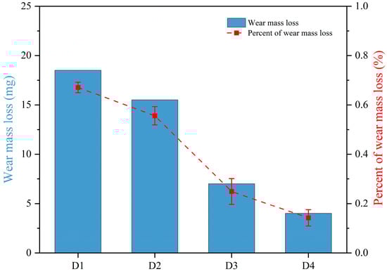 Wear mass loss and percentage of wear mass loss of laser-cladded layers with different WC contents.