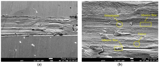 In order to observe the wear mechanism, the wear tracks of the coating with 20 wt.% WC were captured using SEM. By observing Figure 10, it can be found that the coating wear track is relatively smooth, with some debris and spalling on the surface. Additionally, the coating exhibits a few scattered molten particles and evident furrows on the wear track surface. This can be attributed to the relatively high hardness of the friction Si3N4 ball and the lower hardness of the coating. During the wear process, the plastic deformation caused by the frictional force of the small ball on the coating was significant, resulting in the formation of block-like spalling regions on the coating surface. Simultaneously, as the wear process progressed, the spalling material was squeezed to form new wear debris, intensifying the surface wear of the coating. Furthermore, direct contact between the small ball and the coating led to adhesion wear, as the coating material adhered to the Si3N4 ball. Therefore, it is inferred that the main wear mechanisms of the laser-cladded layer are abrasive wear and adhesive wear [].
