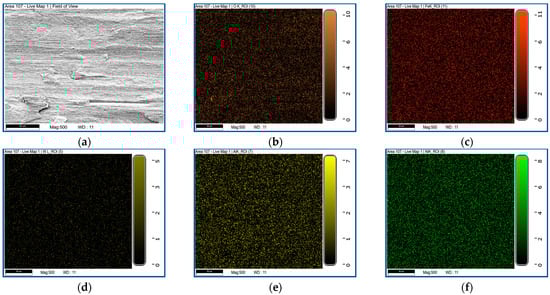 Scanning analysis of element distribution was conducted on the worn surface, as shown in Figure 11. It was observed that the proportion of oxygen elements was significantly higher than other elements, indicating the presence of oxidation wear []. In conclusion, it can be inferred that the laser-cladded layer has a fine and dense microstructure, ensuring both improved hardness and good wear resistance. During the wear process, the hard phases, such as carbides, distributed on the coating surface play a lubricating and supporting role []. Moreover, the predominant wear mechanisms of the coating are abrasive wear and oxidation wear, and the wear condition is relatively favorable.