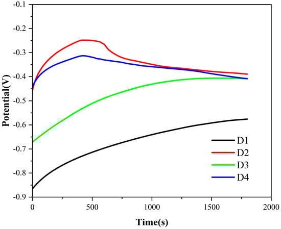 Figure 12 shows the open circuit potential (OCP) curves of four sample groups. From the graph, it can be observed that all four samples reached a steady state after fluctuations. The laser-cladded layers with different percentages of WC content gradually stabilized at −0.65 V, −0.39 V, −0.45 V, and −0.46 V, after an initial stage of continuous rise and fluctuations. This preliminarily indicates that the WC content can alter the corrosion tendency under electrochemical corrosion conditions. OCP, as a thermodynamic parameter, can preliminarily characterize the corrosion tendency of the sample in the corrosive medium. However, it is necessary to combine the results of impedance spectroscopy and polarization curves for a comprehensive assessment.