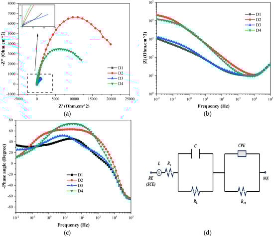 (a) Nyquist plots, (b) Bode impedance plots, (c) phase angle, and (d) equivalent circuit diagram for the D1, D2, D3 and D4 coatings.