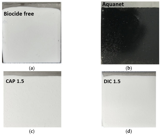 (a) Biocide-free coating; (b) commercial coating AquaNet® Protect; (c) CAP 1.5; (d) DIC 1.5 (5 × 5 cm2).