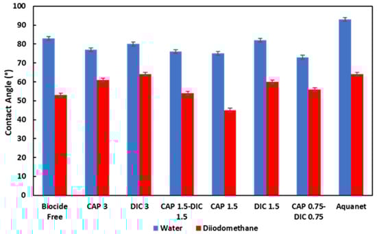 As the surface wettability is an important factor that can affect the antimicrobial activity of an antifouling system, we examined the surface of the coated steel substrates by contact angle analysis (Figure 2). The water contact angles of the biocide-free coating and commercial coating Aquanet were 83° and 93°, respectively, indicating a slightly hydrophobic character. The coatings including biocides showed very small differences in the water contact angle, with values between 75° and 82°, which are close to the water contact angle of the biocide-free analogue. It seems that the incorporation of the biocide into the paint matrix did not significantly affect the surface wettability, which might be due to the small dosage of biocide employed that should be well distributed through the paint matrix. Regarding the behavior in an apolar liquid, diiodomethane, the contact angle values were mostly around or below 60°, indicating a low oleophobic character and a tendency for a moderate attraction for such liquids.